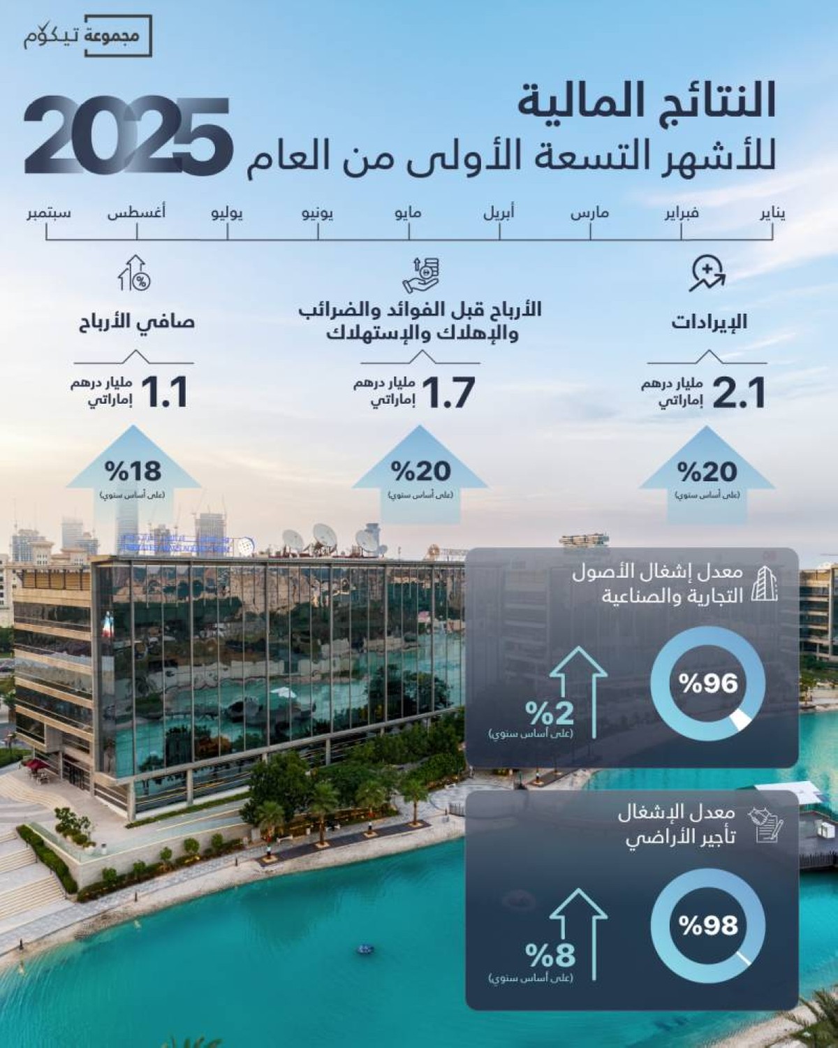 وسجّلت مجموعة تيكوم نمواً قوياً في الإيرادات بنسبة 20% على أساس سنوي لتتجاوز 2.1 مليار درهم إماراتي خلال الأشهر التسعة الأولى من العام، في حين ارتفع صافي الأرباح بنسبة 18% على أساس سنوي ليتخطّى 1.1 مليار درهم إماراتي، مدفوعاً بارتفاع معدلات الإشغال ومتوسط قيمة الإيجار وتحسن الكفاءة التشغيلية والتوسّع الإستراتيجي في محفظة الأصول التجارية والصناعية المتميّزة لدى المجموعة.