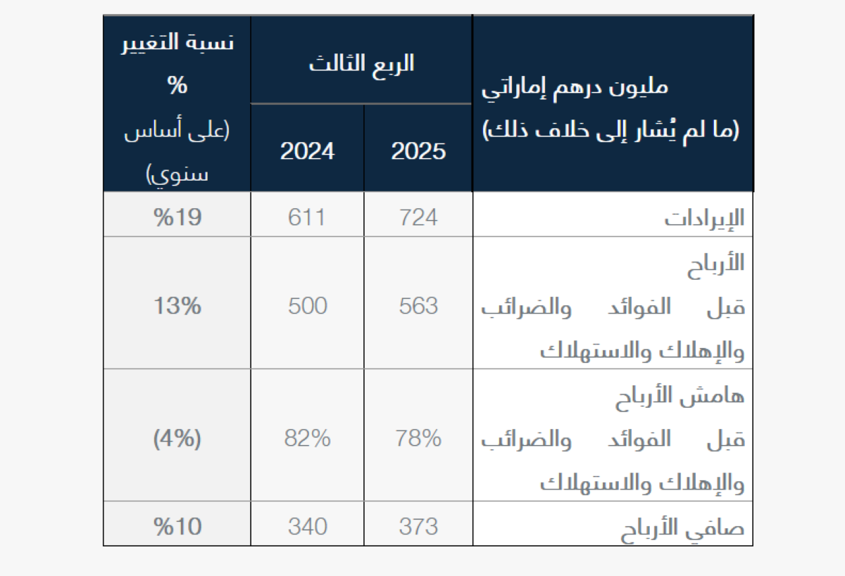 • ارتفع صافي الأرباح بنسبة 10% على أساس سنوي ليصل إلى 373 مليون درهم إماراتي في الربع الثالث من العام 2025، مدعوماً بنمو قوي في الإيرادات والإدارة المالية الحكيمة.