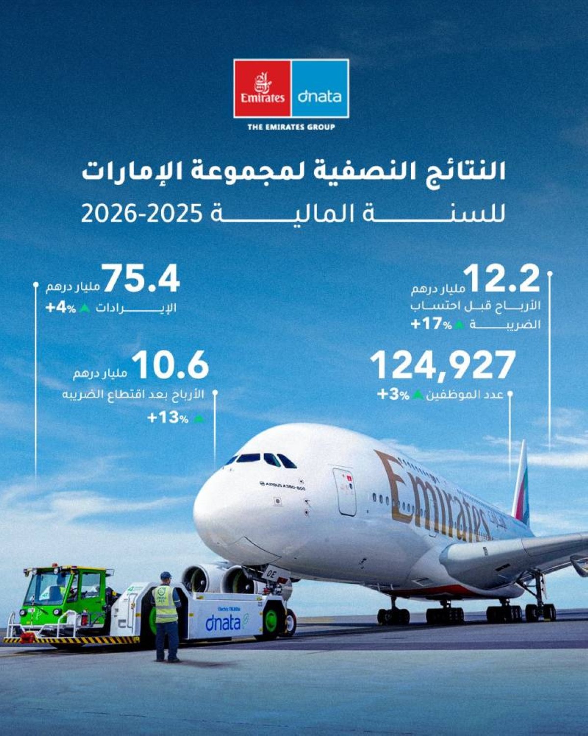أعلنت مجموعة الإمارات اليوم عن تحقيق نتائج مالية قياسية للنصف الأول من السنة المالية 2025-2026، من 1 أبريل وحتى 30 سبتمبر 2025، حيث سجلت أرباحاً قبل احتساب الضريبة بقيمة 12.2 مليار درهم (3.3 مليارات دولار) عن الأشهر الستة الأولى من السنة المالية، ما يجعلها السنة الرابعة على التوالي التي تحقق فيها المجموعة أرباحاً نصفية قياسية.