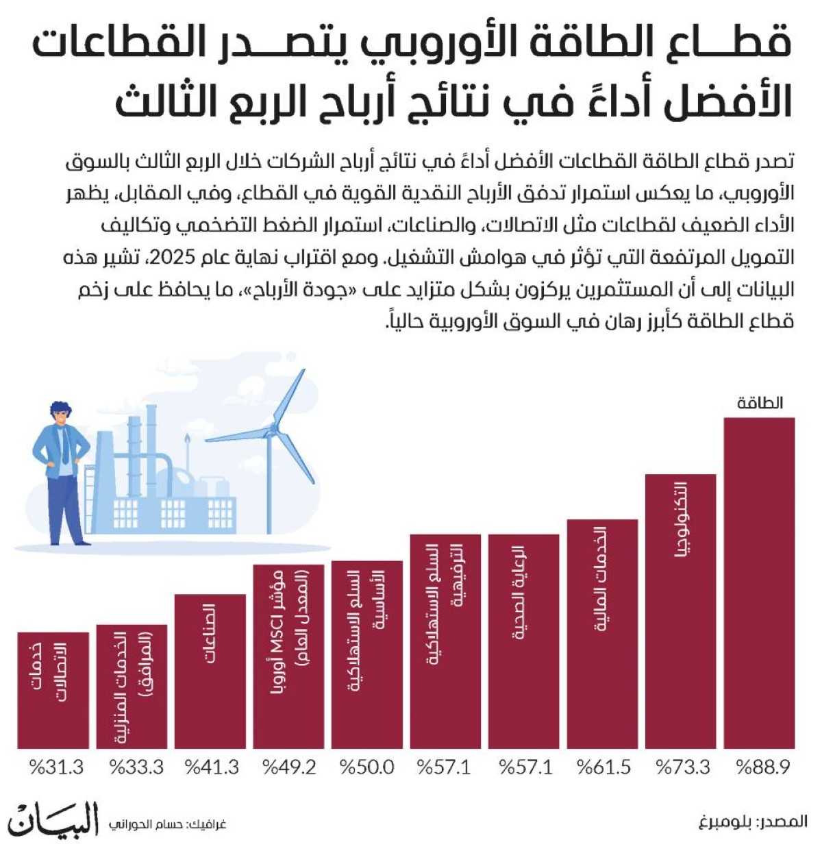 سيطر قطاع الطاقة بنسبة 88.9 % على نتائج أرباح الشركات في الربع الثالث بالسوق الأوروبي، ما يعكس استمرار تدفق الأرباح النقدية القوية في القطاع، وفي المقابل، يظهر الأداء الضعيف لقطاعات مثل الاتصالات 31.3 %.