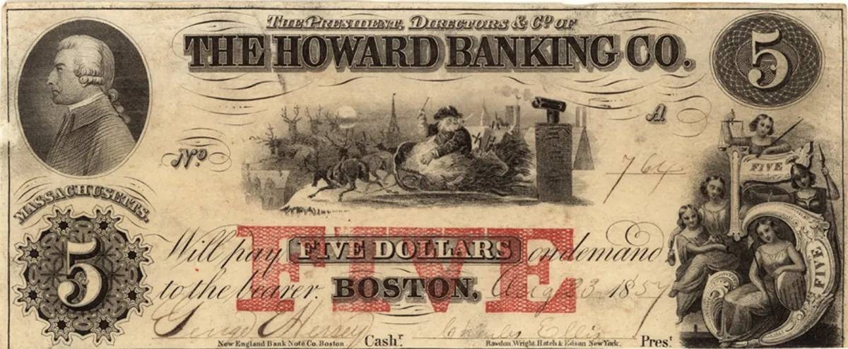 وأوضح الأستاذ مات جاريمسكي من جامعة ولاية يوتا: "ورقة بنك هوارد بقيمة 5 دولارات تحتوي على صورة الرئيس وبجانبها صورة سانتا كلوز على الزلاجة، وتُلزم البنك بدفع قيمتها بالذهب والفضة".