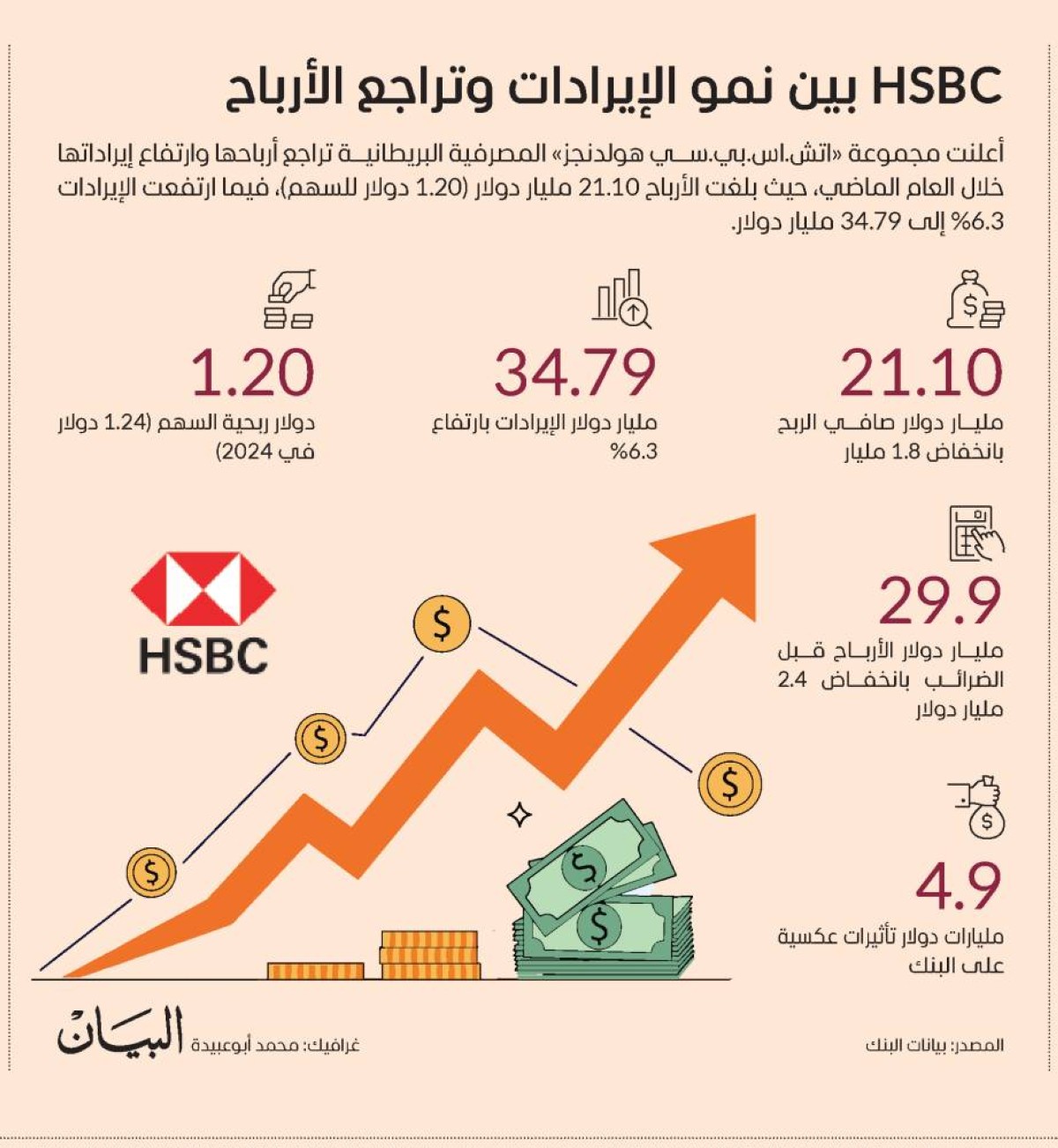أعلنت مجموعة «اتش.اس.بي.سي هولدنجز» المصرفية البريطانية تراجع أرباحها وارتفاع إيراداتها خلال العام الماضي، حيث بلغت الأرباح 21.10 مليار دولار (1.20 دولار للسهم)، فيما ارتفعت الإيرادات 6.3% إلى 34.79 مليار دولار.