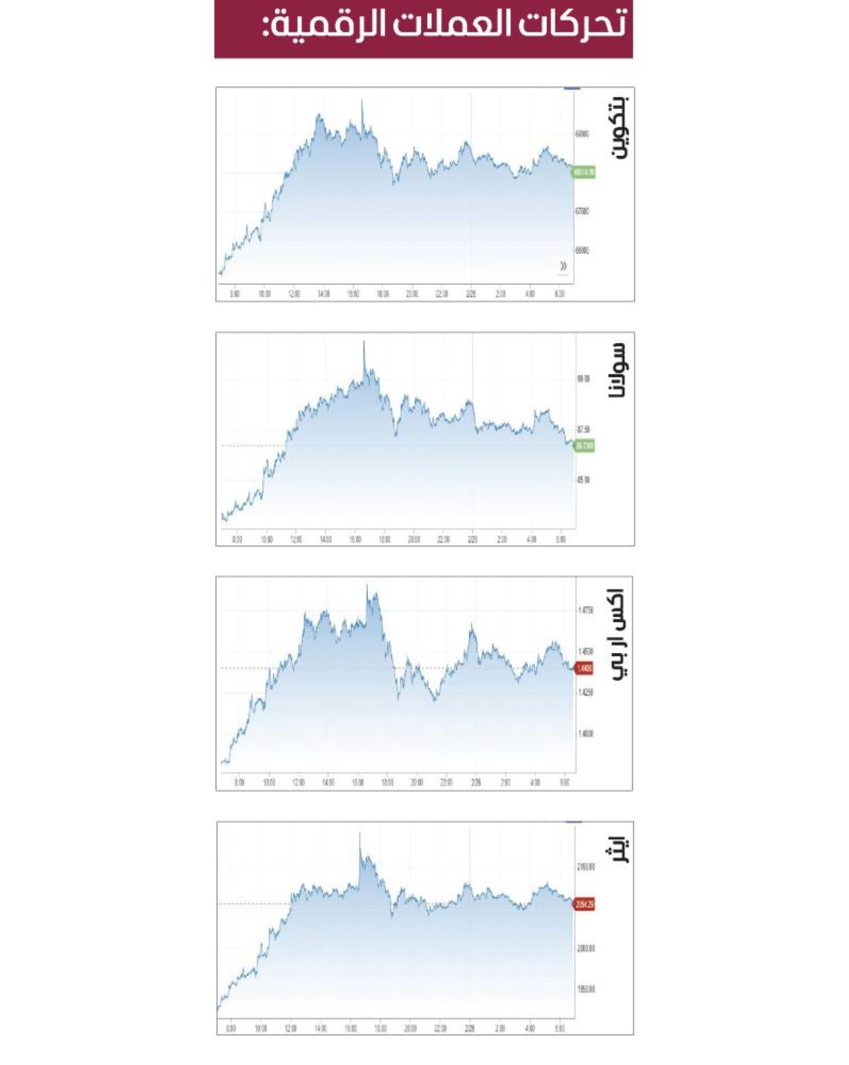 وتراجعت البتكوين 1.3 % إلى 68.169 دولاراً، بعدما قفزت في وقت سابق إلى 69.987 دولاراً.