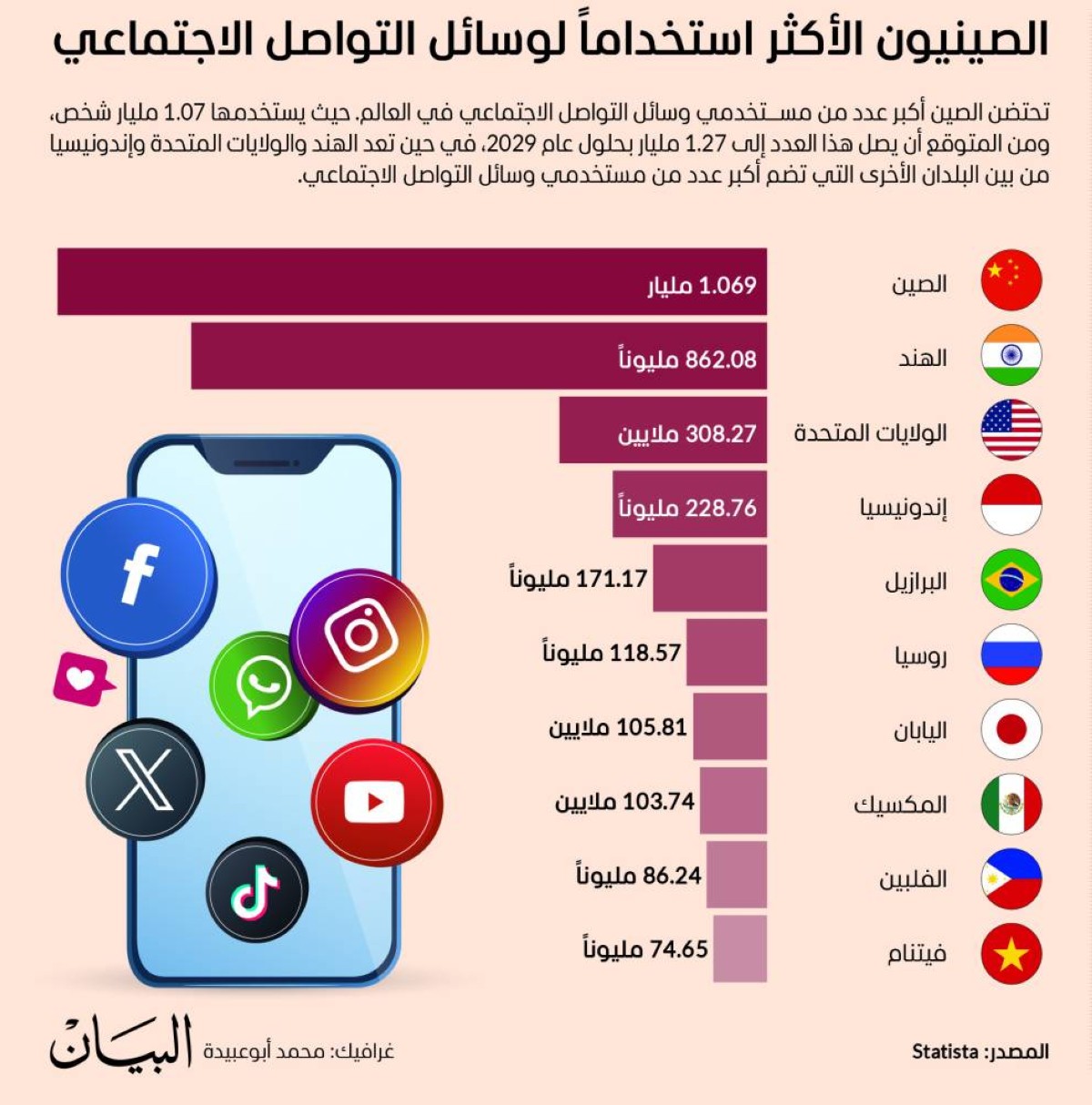 تحتضن الصين أكبر عدد من مستخدمي وسائل التواصل الاجتماعي في العالم. حيث يستخدمها 1.07 مليار شخص، ومن المتوقع أن يصل هذا العدد إلى 1.27 مليار بحلول عام 2029 ، في حين تعد الهند والولايات المتحدة وإندونيسيا من بين البلدان الأخرى التي تضم أكبر عدد من مستخدمي وسائل التواصل الاجتماعي.