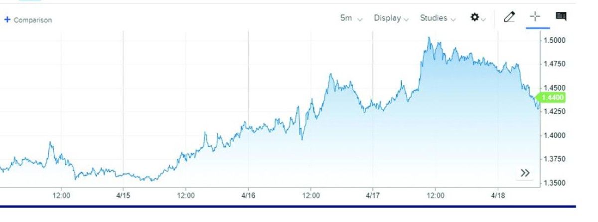 كذلك ارتفعت «دوجكوين» بنسبة 6 % تقريباً وصولاً إلى 0.0994 دولار، مقارنة مع 0.0936 دولار الأسبوع الماضي، وارتفعت «إكس آر بي» بنحو 9 % إلى 1.48 دولار يوم الجمعة، مقارنة مع 1.36 دولار الأسبوع الماضي.