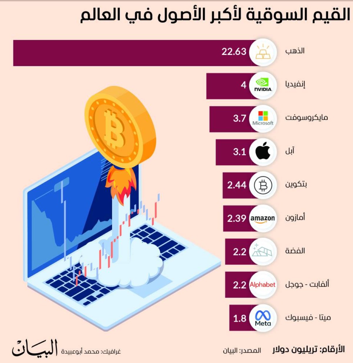 تجاوزت القيمة السوقية لعملة «بتكوين» حاجز 2.44 تريليون دولار لتقفز إلى المركز الخامس عالمياً كأكبر أصل في العالم، بعدما قفز سعر العملة ولامس حاجز 123 ألف دولار.