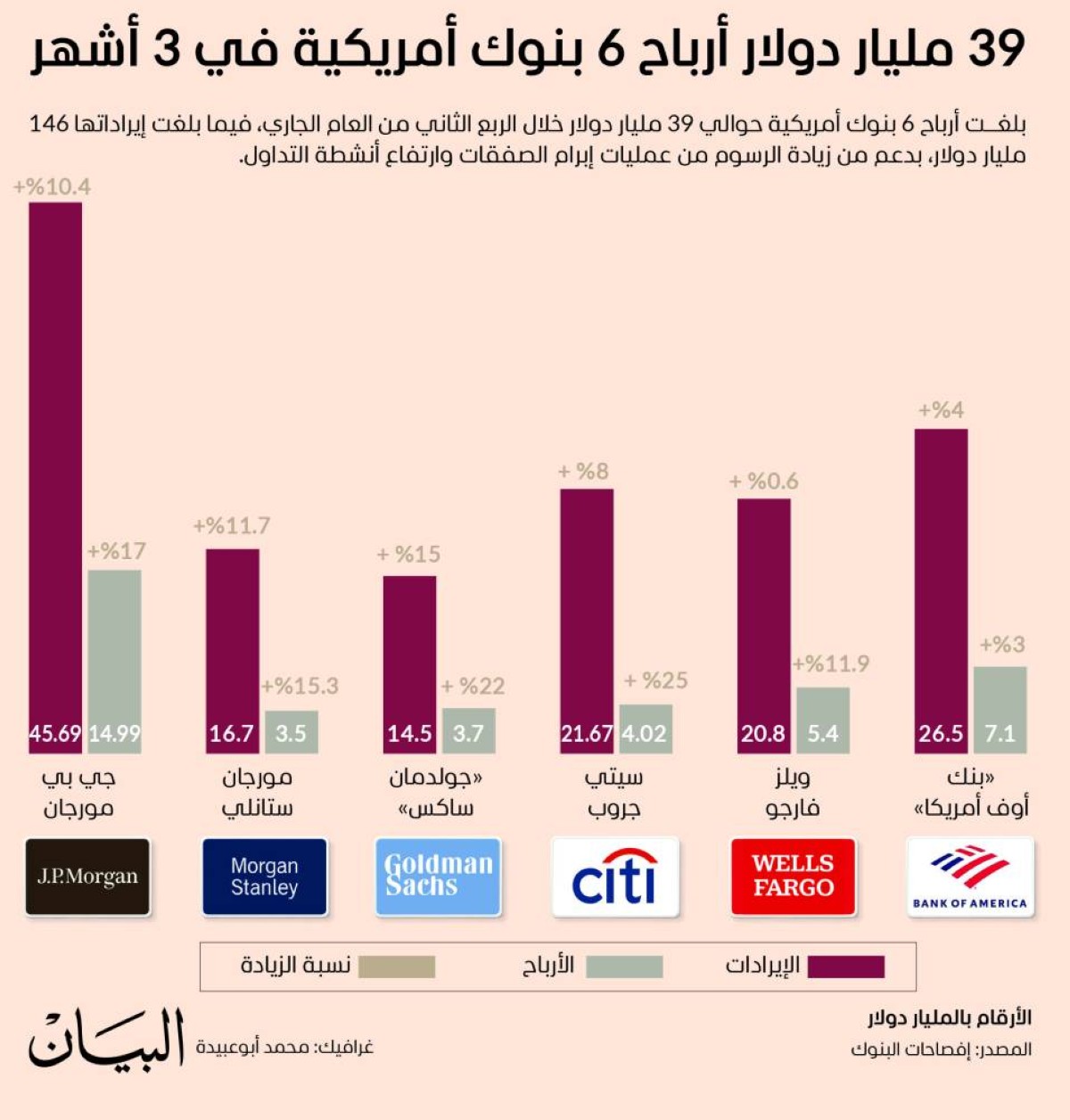 بلغت أرباح 6 بنوك أمريكية حوالي 39 مليار دولار خلال الربع الثاني من العام الجاري، فيما بلغت إيراداتها 146 مليار دولار، بدعم من زيادة الرسوم من عمليات إبرام الصفقات وارتفاع أنشطة التداول.