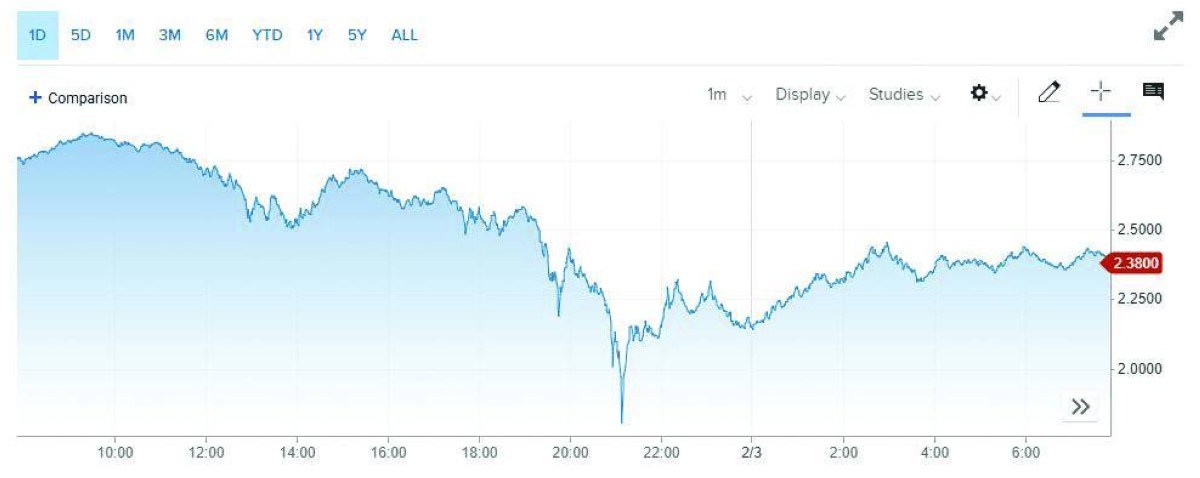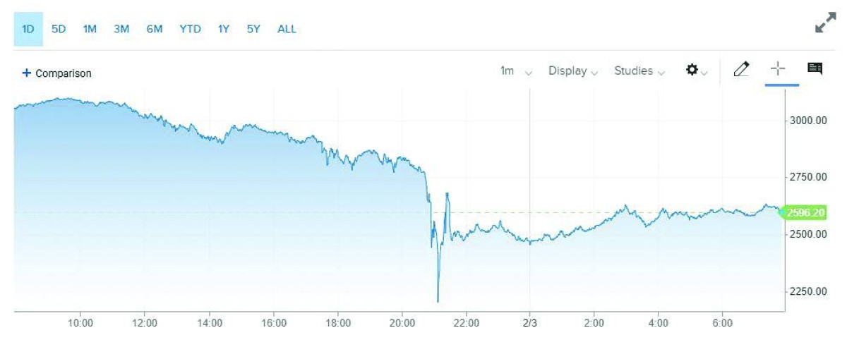 وهبط كل من الإيثريوم 15.55% إلى 2497.69 دولاراً، لتتداول عند أدنى مستوياتها منذ نوفمبر، والريبل 13.2% عند 2.2618 دولار، ودوج كوين 12% إلى 23.58 سنتاً.