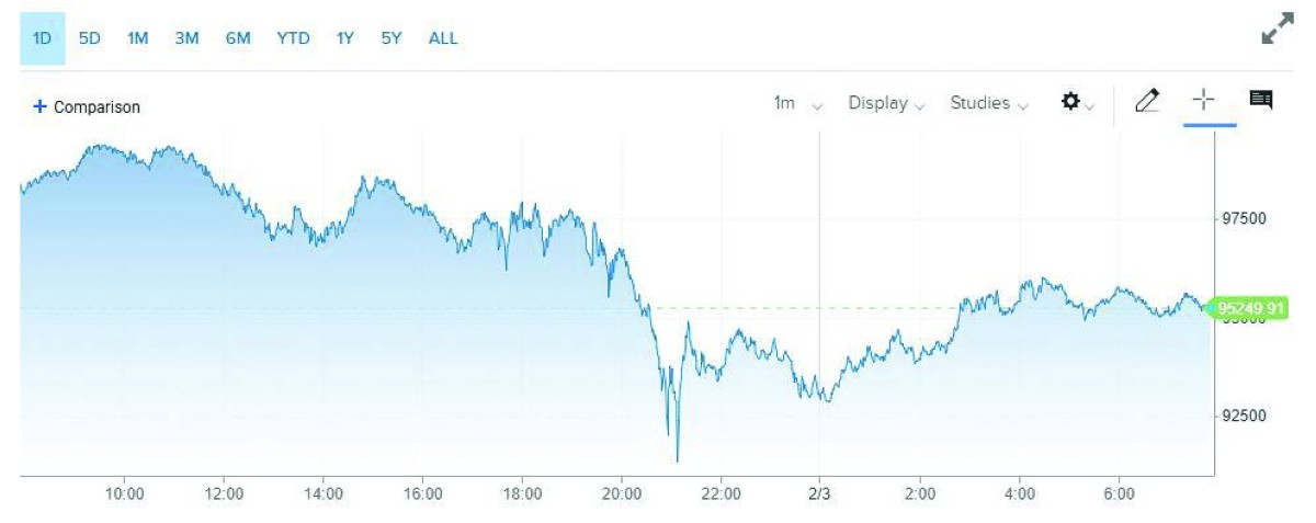هبطت العملات المشفرة بصورة جماعية في تعاملات الاثنين لتتداول البيتكوين عند مستوى 94 ألف دولار، بعدما فرض الرئيس الأمريكي دونالد ترامب تعريفات جمركية على كندا والمكسيك والصين. وتراجعت العملة الافتراضية الأكبر في العالم من ناحية القيمة السوقية «البيتكوين» بنسبة 3.84% عند 94033.25 دولاراً، في التداولات، وفقاً لبيانات «كوين باس».