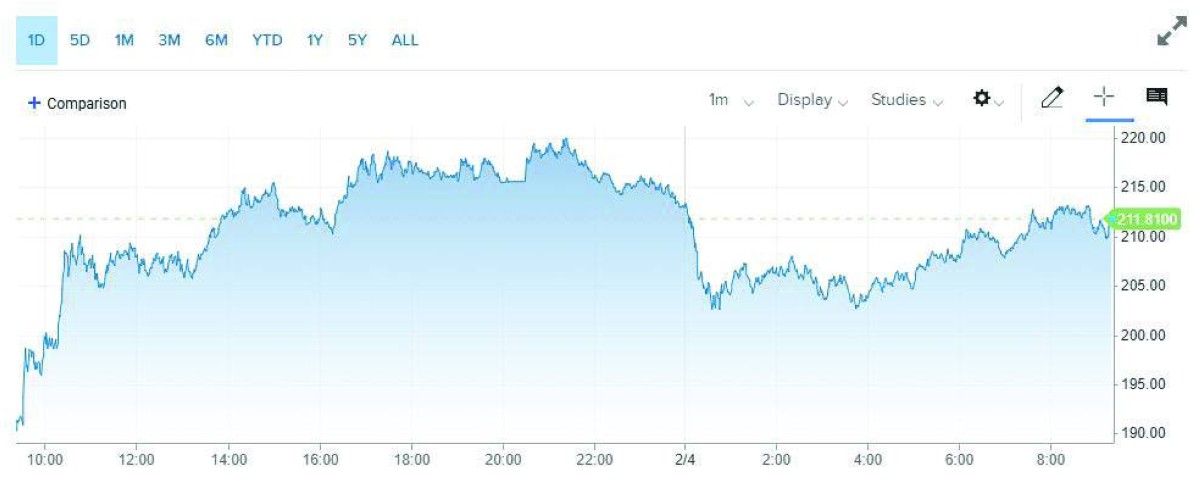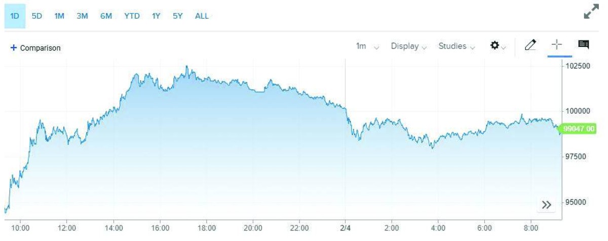 وبلغ سعر بتكوين 98517 دولاراً خلال التداولات، أي أقل بنحو 10% من أعلى مستوى قياسي لها.