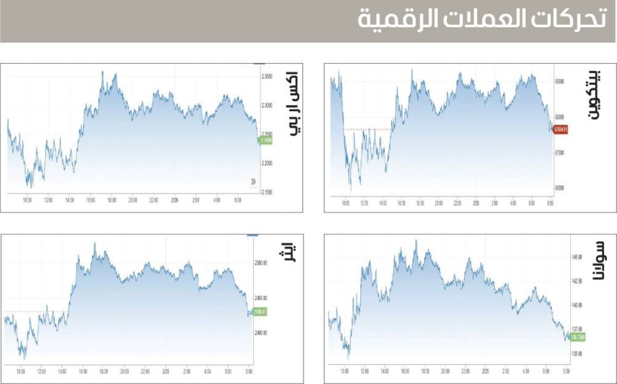 وتراجعت كل من الإيثريوم بنسبة 1 % إلى 2.466 دولار، والريبل 1.31 % إلى 2.299 دولار، ودوج كوين 0.81 % إلى 21.06 سنتاً، وعملة «ترامب» الرمزية بنسبة 0.42 % إلى 13.04 دولاراً.