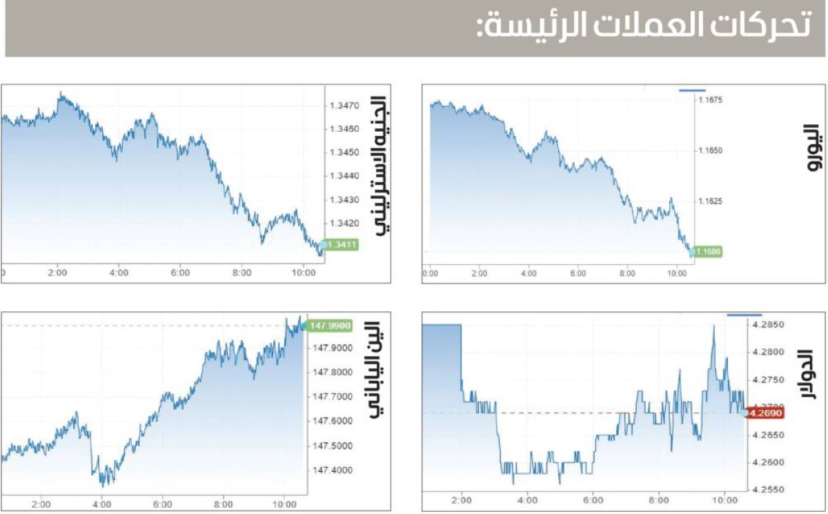 وانخفض مؤشر الدولار 0.2% إلى 98.073 بعد تراجع بنسبة 0.4% الأسبوع الماضي. ونزلت العملة الأمريكية أمام الين الياباني إلى 147.46 يناً بانخفاض قدره 0.20% عن آخر تعاملات أمريكية في ظل إغلاق الأسواق اليابانية بمناسبة عطلة «يوم الجبل».