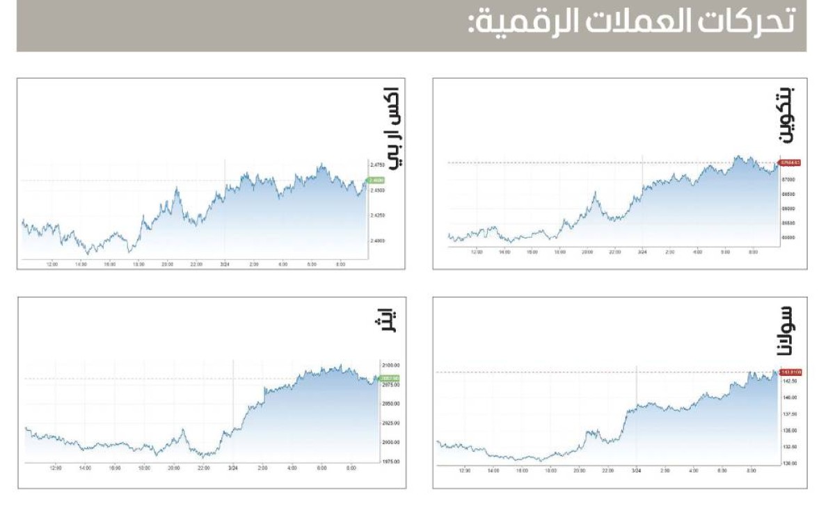 ارتفعت أسعار العملات المشفرة خلال تعاملات أمس، وسط توقعات تقليص الرئيس الأمريكي دونالد ترامب حدة الرسوم الجمركية المتبادلة، التي هدد بفرضها على كافة الدول في الثاني من أبريل القادم.