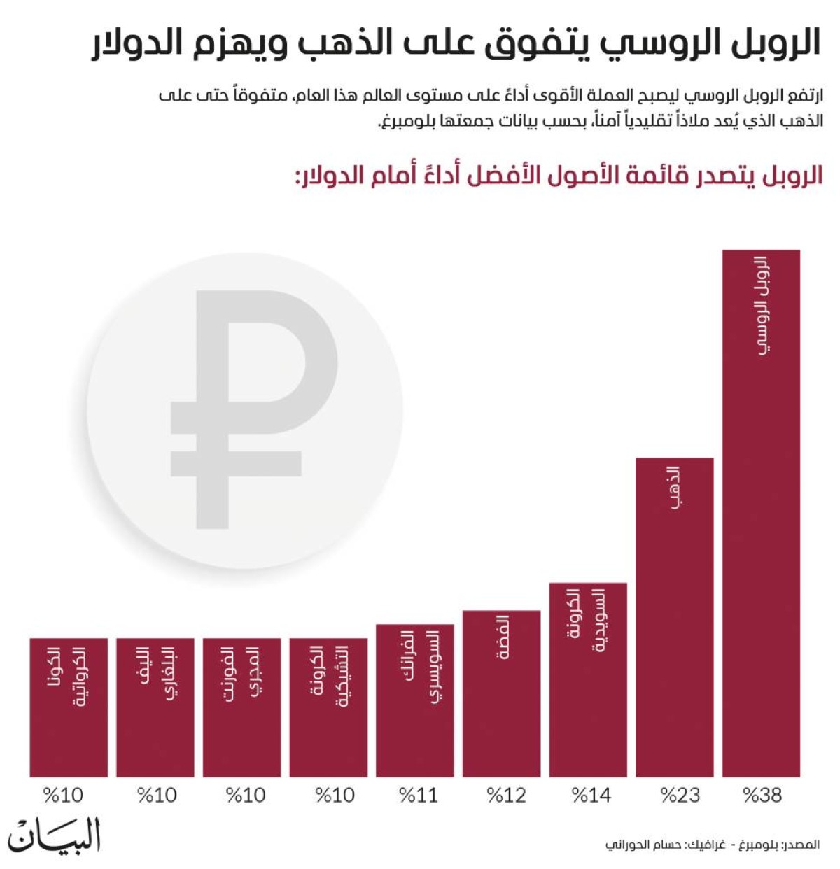 ارتفع الروبل الروسي ليصبح العملة الأقوى أداءً على مستوى العالم هذا العام، متفوقاً حتى على الذهب الذي يُعد ملاذاً تقليدياً آمناً، بحسب بيانات جمعتها بلومبرغ.