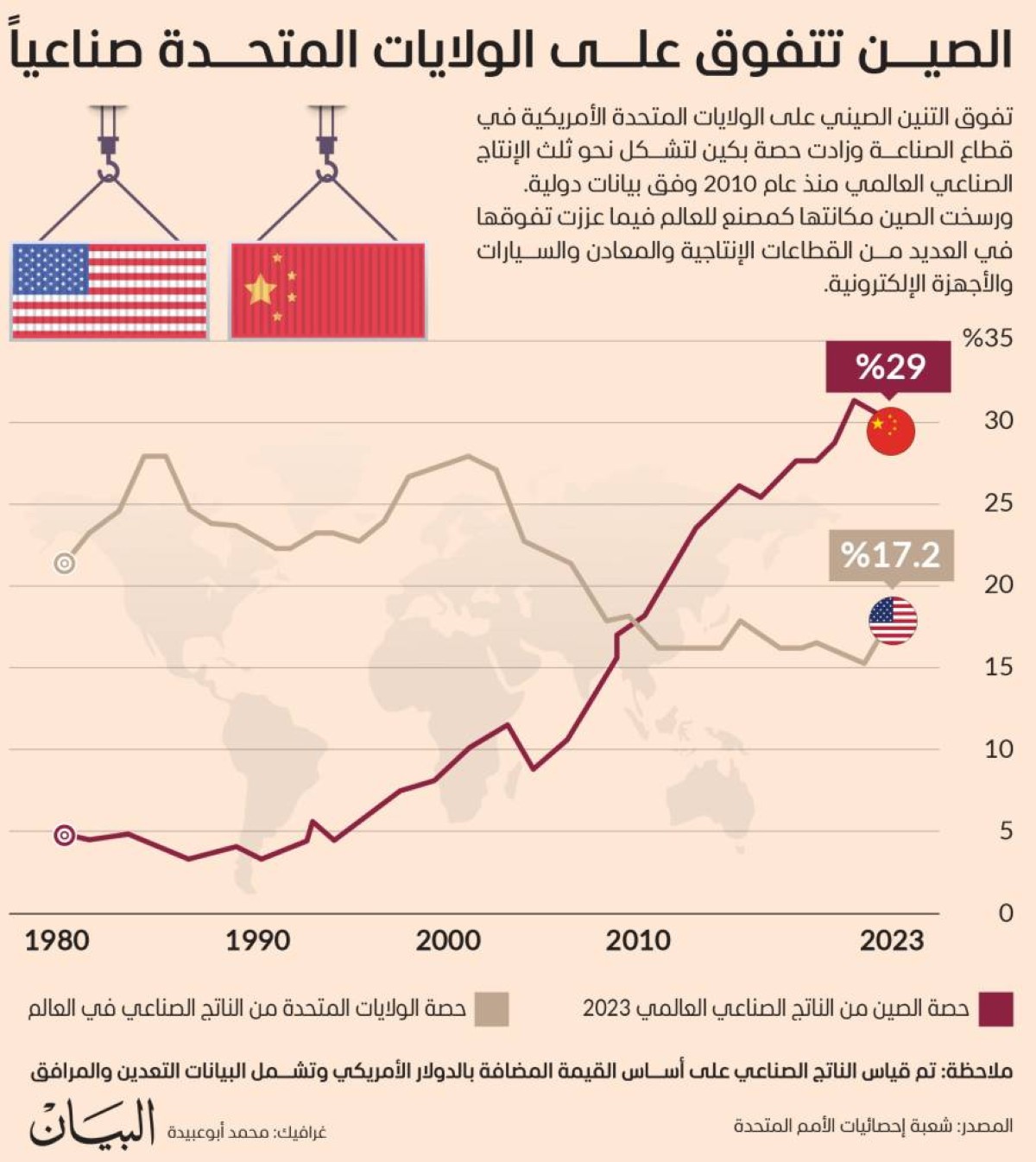 تفوق التنين الصيني على الولايات المتحدة الأمريكية في قطاع الصناعة وزادت حصة بكين لتشكل نحو ثلث الإنتاج الصناعي العالمي منذ العام 2010 وفق بيانات دولية.