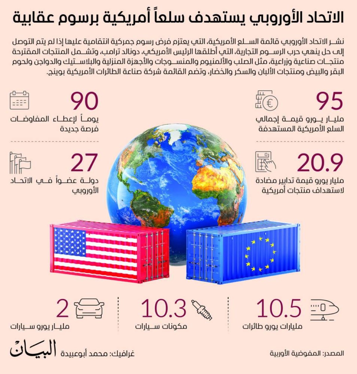 نشر الاتحاد الأوروبي قائمة السلع الأمريكية، التي يعتزم فرض رسوم جمركية انتقامية عليها إذا لم يتم التوصل إلى حل ينهي حرب الرسوم التجارية، التي أطلقها الرئيس الأمريكي، دونالد ترامب، وتشمل المنتجات المقترحة