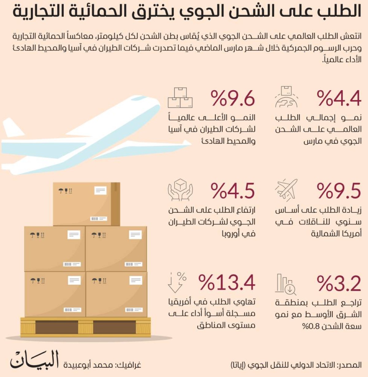 انتعش الطلب العالمي على الشحن الجوي الذي يُقاس بطن الشحن لكل كيلومتر، معاكساً الحمائية التجارية وحرب الرسوم الجمركية خلال شهر مارس الماضي فيما تصدرت شركات الطيران في آسيا والمحيط الهادئ الأداء عالمياً.