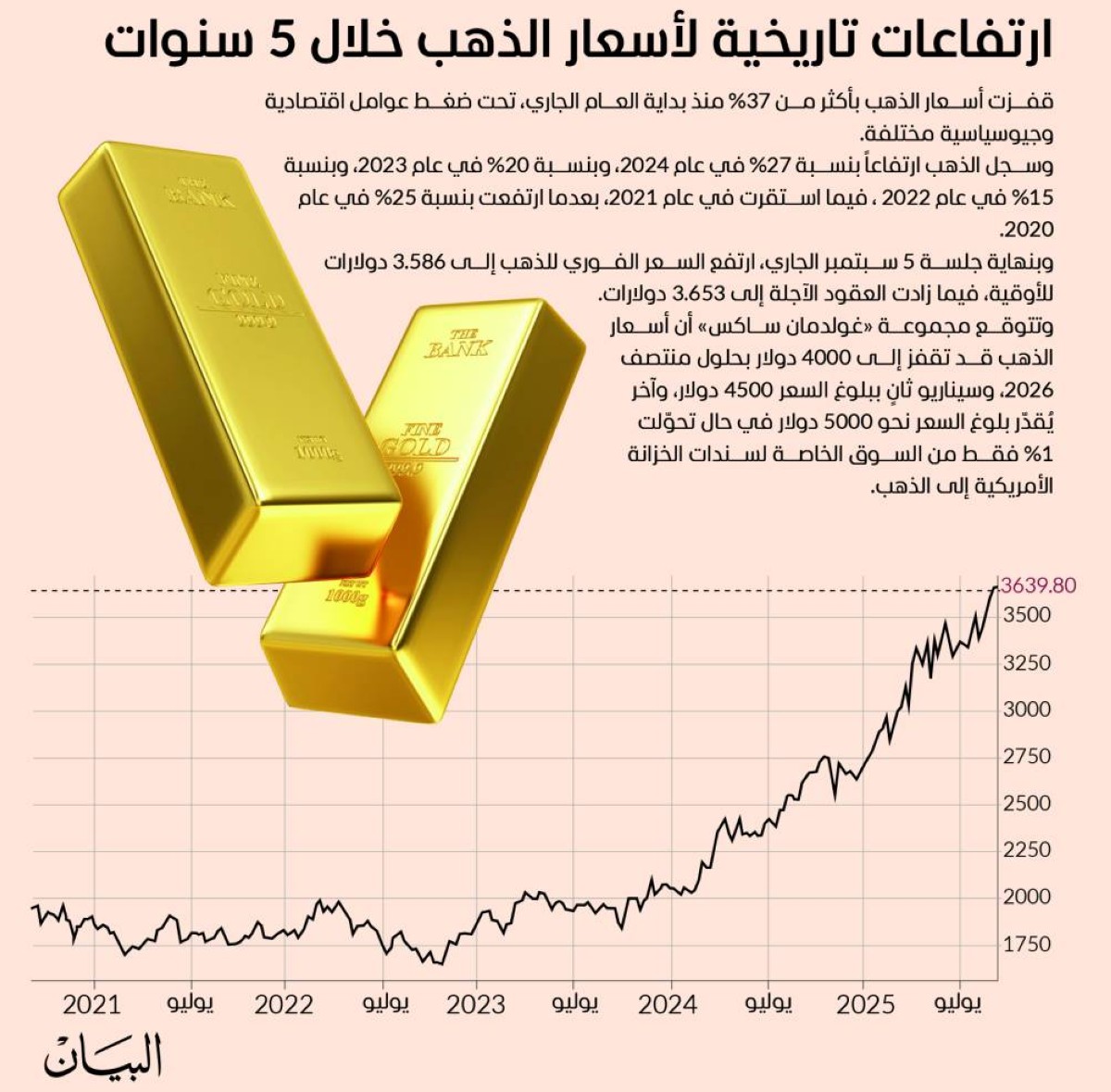 وسجل الذهب ارتفاعاً بنسبة 27 % في عام 2024 ، وبنسبة 20 % في عام 2023 ، وبنسبة %15 في عام 2022 ، فيما استقرت في عام 2021 ، بعدما ارتفعت بنسبة 25 % في عام 2020 وبنهاية جلسة 5 سبتمبر الجاري، ارتفع السعر الفوري للذهب إلى 3.586 دولارات للأوقية، فيما زادت العقود الآجلة إلى 3.653 دولارات.