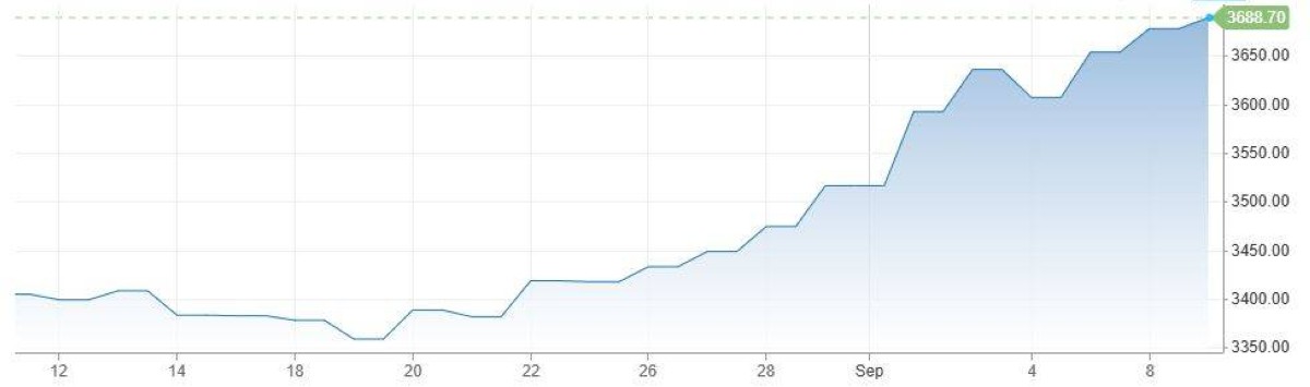 قفزت أسعار الذهب إلى ذروة جديدة، خلال تداولات أمس، لتتجاوز عتبة 3700 دولار، وذلك مع ارتفاع الطلب على المعدن النفيس، بعد التوترات الجيوساسية التي شهدتها المنطقة، بضرب إسرائيل قيادات حركة حماس في الدوحة،.