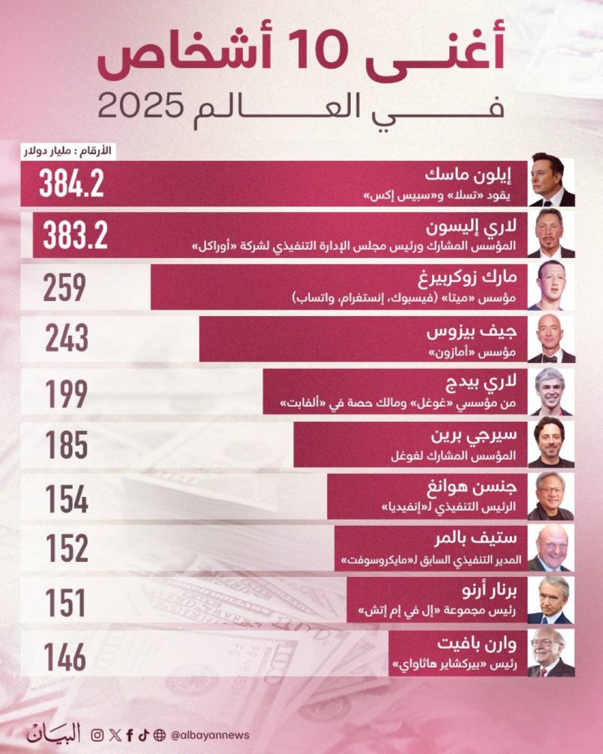 هذا وقد أصبح ماسك أغنى شخص في العالم لأول مرة قبل أربع سنوات، والسبب الرئيسي هو حصته في شركة تسلا، بينما ثروة إليسون تعود إلى شركة «أوراكل».