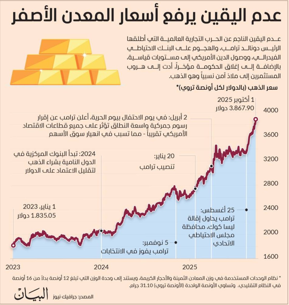 وصعد الذهب في المعاملات الفورية 0.3% إلى 3970.59 دولاراً للأوقية «الأونصة»، ليتداول بالقرب من أعلى مستوى له على الإطلاق عند 3977.19 دولاراً، الذي سجله في وقت سابق من الجلسة.