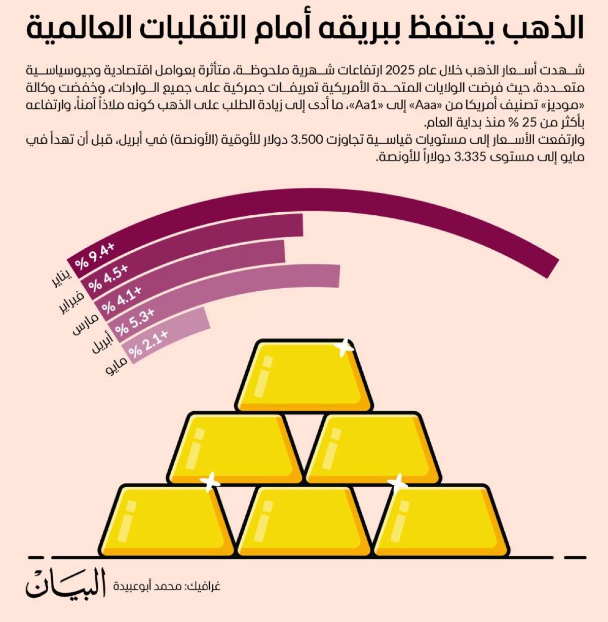 شهدت أسعار الذهب خلال عام 2025 ارتفاعات شهرية ملحوظة، متأثرة بعوامل اقتصادية وجيوسياسية متعددة، حيث فرضت الولايات المتحدة الأمريكية تعريفات جمركية على جميع الواردات، وخفضت وكالة «موديز» تصنيف أمريكا من «Aaa» إلى «Aa1» ، ما أدى إلى زيادة الطلب على الذهب كونه ملاذاً آمناً، وارتفاعه بأكثر من 25 % منذ بداية العام.