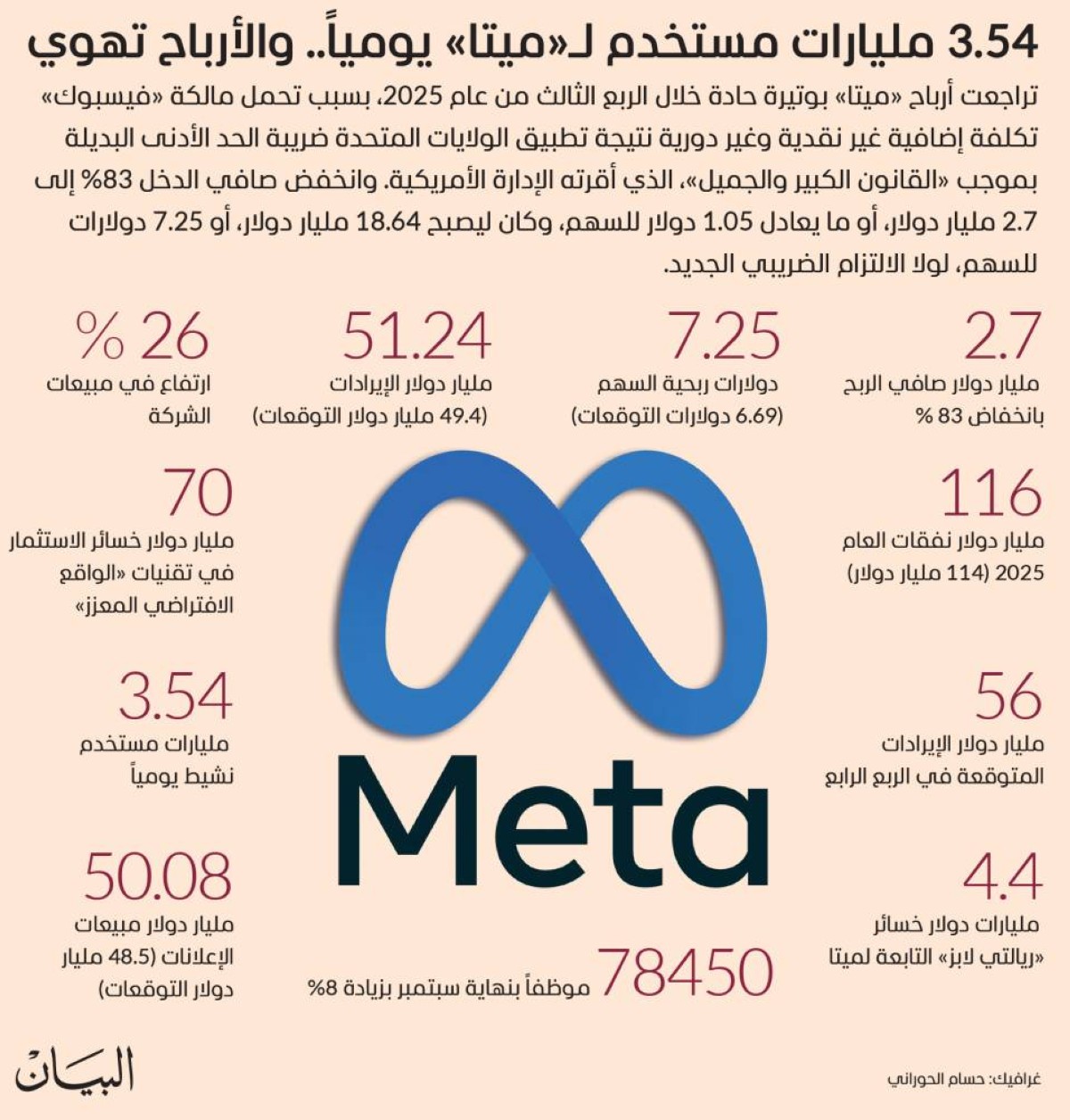 تراجعت أرباح «ميتا» بوتيرة حادة خلال الربع الثالث من عام 2025، بسبب تحمل مالكة «فيسبوك» تكلفة إضافية غير نقدية وغير دورية نتيجة تطبيق الولايات المتحدة ضريبة الحد الأدنى البديلة بموجب «القانون الكبير والجميل»، الذي أقرته الإدارة الأمريكية.