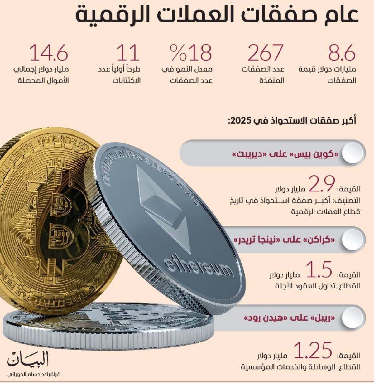 شهدت سوق العملات الرقمية في 2025 إبرام صفقات قياسية بلغت قيمتها 8.6 مليارات دولار، مع تهيئة الحكومة الأمريكية للأصول الرقمية أجواءً مواتية لموجة من عمليات الدمج والاستحواذ التي يتوقع استمرارها خلال العام المقبل.