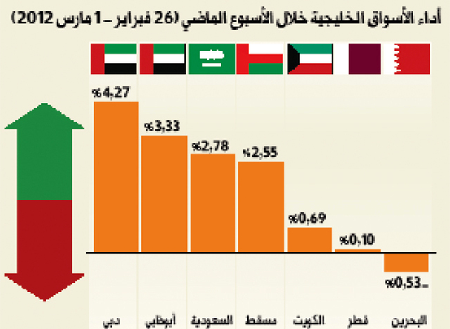 حققت ستة من أسواق المال الخليجية مكاسب خلال الأسبوع الماضي بصدارة أسواق الإمارات التي قادت قاطرة الارتفاعات الخليجية. فيما تراجع وحيداً مؤشر البورصة البحرينية وبنسبة انخفاض بلغت 0.53%. وواصل سوق دبي المالي للأسبوع الثاني على التوالي صدارة ارتفاعات أسواق المال الخليجية بارتفاع نسبته 4.27%.