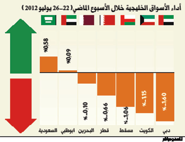 وارتفع مؤشر السوق المالي السعودي بنسبة 0.58%. وتلاه سوق أبوظبي للأوراق المالية الذي ربح ما نسبته 0.09٪. وفي المقابل تصدر التراجعات مؤشر سوق دبي المالي فاقداًً ما نسبته 1.69%. وتلاه مؤشر السوق الكويتي هابطاً بنسبة 1.15%. ثم مؤشر سوق مسقط متراجعاً 1.06%. ومن بعده مؤشر السوق القطري منخفضاً بنسبة 0.66%. وكان مؤشر السوق البحريني الأقل تراجعاً خليجياً خلال الأسبوع هابطاً بنسبة 0.10% .