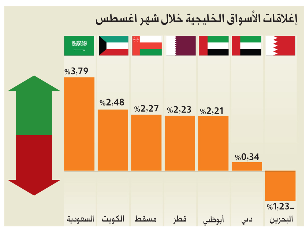 وارتفع مؤشر السوق السعودي بنهاية تداولات شهر أغسطس بنسبة 3.79% مقارنة مع إغلاقه في نهاية يوليو الماضي. وهي المرة الأولى منذ أبريل الماضي التي ينهي فيها المؤشر العام للسوق تداولاته الشهرية فوق مستوى 7100 نقطة. وتلاه مؤشر السوق الكويتي بارتفاع نسبته 2.48%. ثم مؤشر السوق العُماني صاعداً بنسبة 2.27%. ومن بعده مؤشر السوق القطري بارتفاع نسبته 2.23%. يليه مؤشر سوق أبوظبي للأوراق المالية المرتفع بما نسبته 2.21%. وكان مؤشر سوق دبي المالي الأقل ارتفاعًا خليجياً مكتسباً ما نسبته 0.34%.