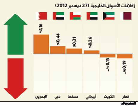 وتصدر المؤشر البحريني الرابحين مرتفعاً بنسبة 1.16 %. وتبعه مؤشر سوق دبي المالي صاعداً بنسبة 0.44 %. ثم مؤشر سوق مسقط بنسبة 0.31 %. وكان مؤشر سوق أبوظبي للأوراق المالية الأقل ارتفاعاً خليجياً صاعداً بنسبة 0.26 %.