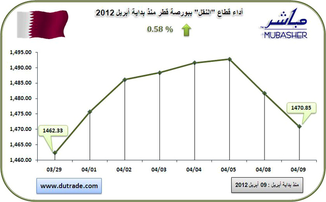 حـقق مؤشـر قطـاع النقل في سوق المـال القطري مـنذ نهاية الربع الثالث مـن 2012 وحـتى نهـاية تعاملات جلسة 23 ديسمبر الحـالي ارتفاعا بلغـت نسـبته 1.2% بإقفاله عند مستوى 1357.41 نقطة مقابل 1341.6 نقطة بنهـاية سبتمبر الماضي مما يعني أنه ربح خلال تلك الفترة أكثر من 15.75 نقطة.