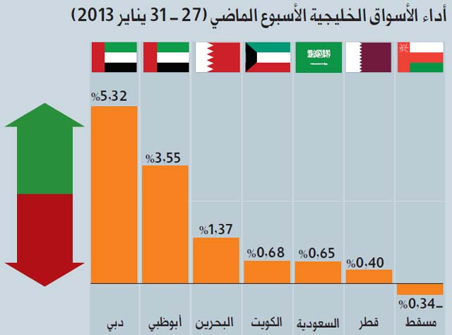 تصدرت أسواق الإمارات ستة بورصات خليجية رابحة خلال الأسبوع الماضي لتكتسي مؤشراتها باللون الأخضر. فيما تراجع سوق مسقط وحيداً إلى المنطقة الحمراء. وقاد المؤشر العام لسوق دبي المالي الارتفاعات الخليجية رابحاً ما نسبته 5.32 %. وتبعه مؤشر سوق أبو ظبي للأوراق المالية بارتفاع نسبته 3.55 %. ثم مؤشر سوق البحرين بارتفاع نسبته 1.37 %. ومن بعده مؤشر السوق الكويتي السعري بارتفاع نسبته 0.68 %. يليه مؤشر السوق المالية السعودية بارتفاع نسبته 0.65 %. وكان مؤشر السوق القطري الأقل ارتفاعًا خليجياً رابحاً ما نسبته 0.40 %. وفي المقابل تراجع مؤشر سوق مسقط بنسبة 0.34 % خلال الأسبوع.