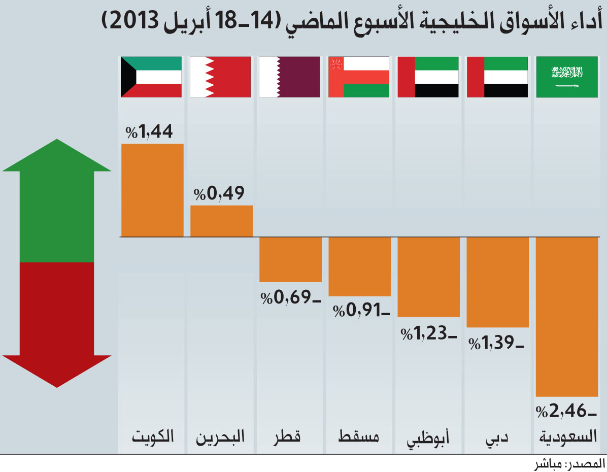 وكان في صدارة هذه التراجعات مؤشر السوق المالية السعودية المتراجع بنسبة 2.46 ٪ بعد ارتفاعه لستة أسابيع متتالية. وتلاه مؤشر سوق دبي المالي منخفضاً بنسبة 1.39 ٪. ثم مؤشر سوق أبو ظبي للأوراق المالية بنسبة 1.23 ٪. ومن بعده مؤشر سوق مسقط بنسبة 0.91 ٪. وكان مؤشر السوق القطري الأقل تراجعًا خلال الأسبوع هابطاً بنسبة 0.69 ٪.