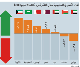 نجحت 5 من أسواق المال الخليجية الأسبوع الماضي في الارتفاع، في حين هبطت مؤشرات السوقين؛ أبوظبي والعُماني، حسبما أفاد تقرير مباشر، وتصدر الرابحين مؤشر سوق الكويت الذي ربح 3.19% خلال الأسبوع، وتبعه ارتفاع مؤشر السوق السعودية بارتفاع 3.02%.