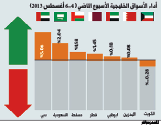 وبلغت مكاسب مؤشر سوق دبي خلال الأسبوع ما نسبته 3.06 %. وتبعه مؤشر السوق المالية السعودية بارتفاع نسبته 2.04 %. ثم مؤشر السوق العُماني بارتفاع نسبته 1.58 %. وتبعهم مؤشر السوق القطري بارتفاع نسبته 1.45 %. يليه مؤشر سوق أبو ظبي للأوراق المالية المرتفع بنسبة 0.18 %. وكان مؤشر السوق البحريني الأقل ارتفاعًا خليجياً صاعداً بنسبة 0.08 %.