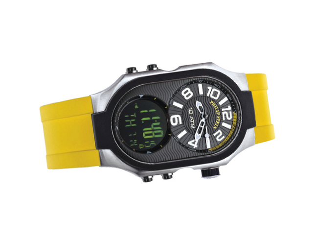 إنها ساعة «فيليب شتاين» كرونوغراف ذات الوظائف الرقمية المتعدّدة والتي تتميّز بعلبة الساعة باللون الأسود وسوار مطاطي باللون الأصفر يبرزان الرؤية الفريدة لتصممي هذه الساعة، بالإضافة إلى مقاومتها حتى 350 قدماً تحت الماء.