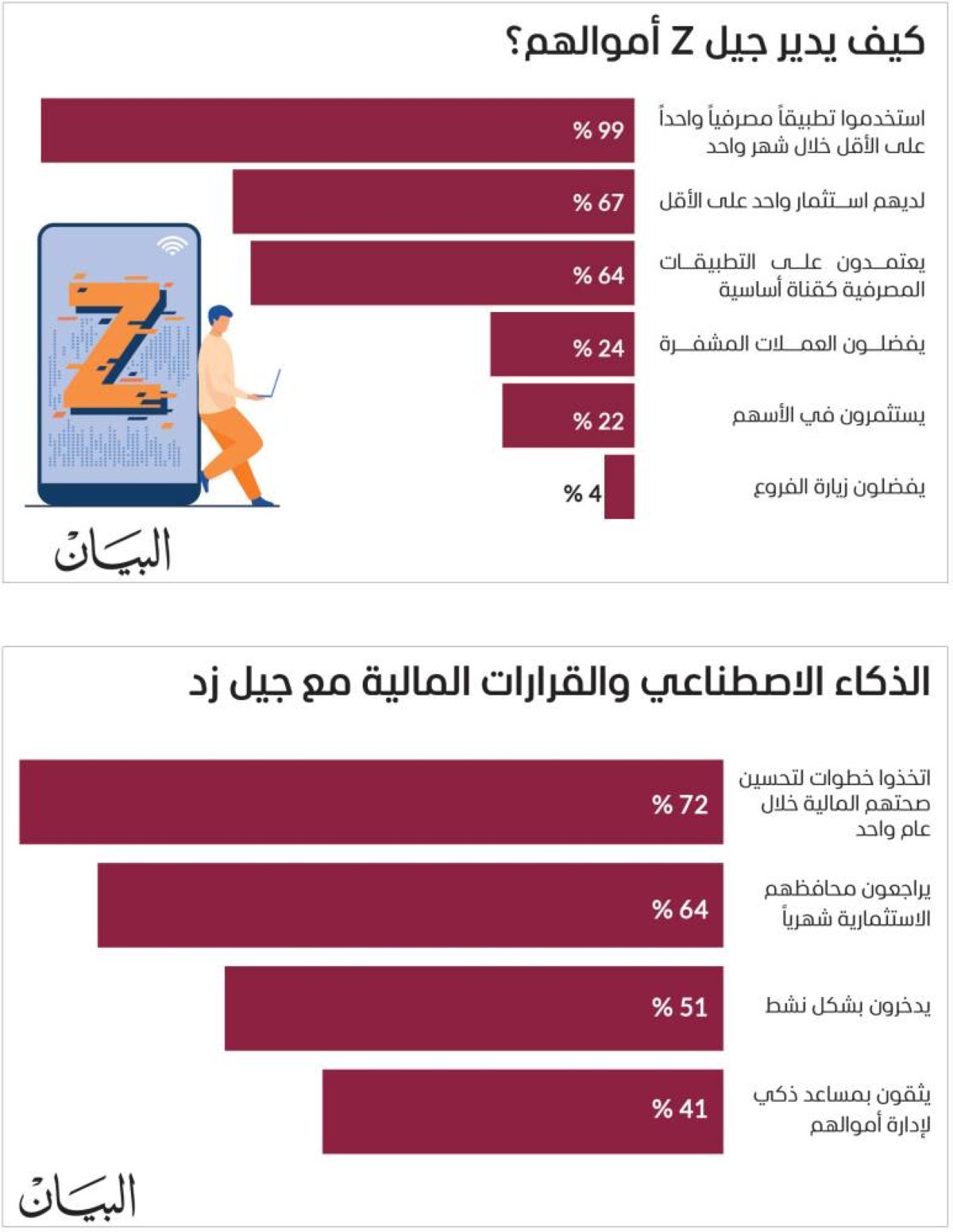 كما يثق 41% من شباب هذا الجيل بالحلول المدعومة بالذكاء الاصطناعي لإدارة أموالهم، ويعيد 64% منهم مراجعة محافظهم الاستثمارية بشكل شهري، كما تؤثر وسائل التواصل الاجتماعي بشكل مباشر في قرارات جيل زد المالية، إذ يعتمد عدد كبير من الشباب على المنصات الرقمية كمصدر رئيسي للتعلم المالي وتكوين توجهاتهم الاستثمارية.. «البيان» تستعرض هذه الأرقام وتتناولها بالتحليل مع مجموعة من الخبراء والمختصين.