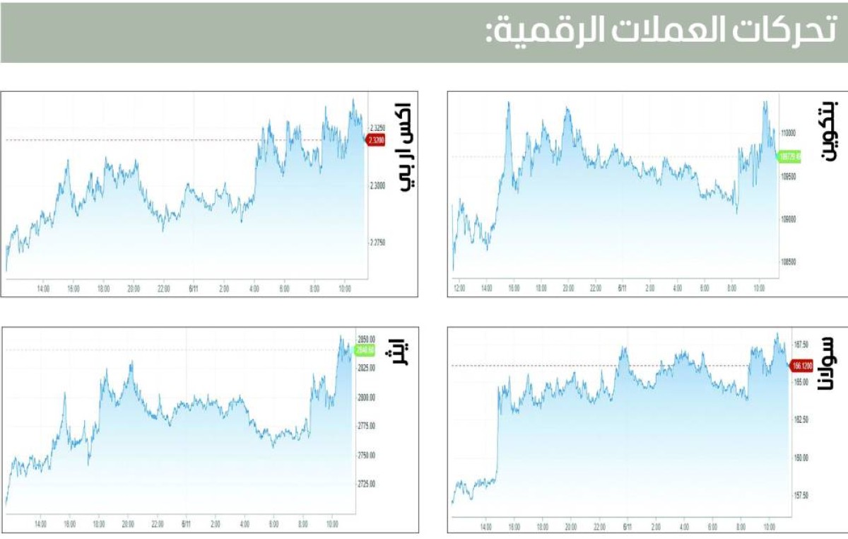 ارتفعت «بتكوين» بنسبة وصلت إلى 1.7%، لتبلغ 110.572 دولارات يوم الثلاثاء، لكنها انخفضت بنسبة 0.2% إلى 109585.5 دولاراً أمس، وتستحوذ على نحو 63.1% من إجمالي قيمة سوق العملات المشفرة.