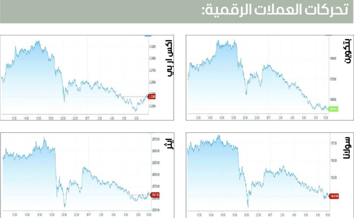 وتراجعت البتكوين بنسبة 2.54% إلى 105.188 دولاراً، كما تراجعت الإيثريوم 3.91% عند 2.550 دولار، وانخفضت عملة اكس أر بي بنسبة 2.6% إلى مستوى 2.2 دولار، وهبط سعر الريبل 3.43% إلى 2.24 دولار، وانخفضت عملة «دوج كوين» 3.47% عند 17.36 سنتاً.