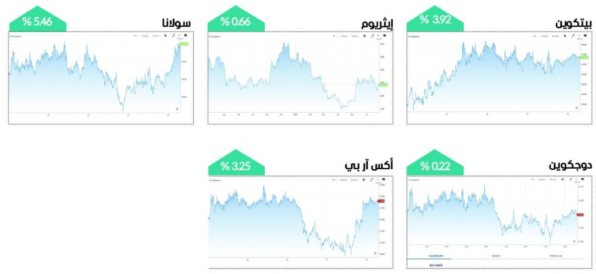 وتحركت كل من «إيثريوم» وسولانا بهامش ضيق، حيث شهدت عملة «إيثريوم» ارتفاعاً نسبياً، لكنها لا تزال تدور فوق مستويات الـ2400 دولار، وهي نفس مستويات نهايات الأسبوع الماضي أيضاً. واستقرت كل من سولانا (عند مستويات الـ140 دولاراً) ودوجكوين وXPR خلال تعاملات الأسبوع.