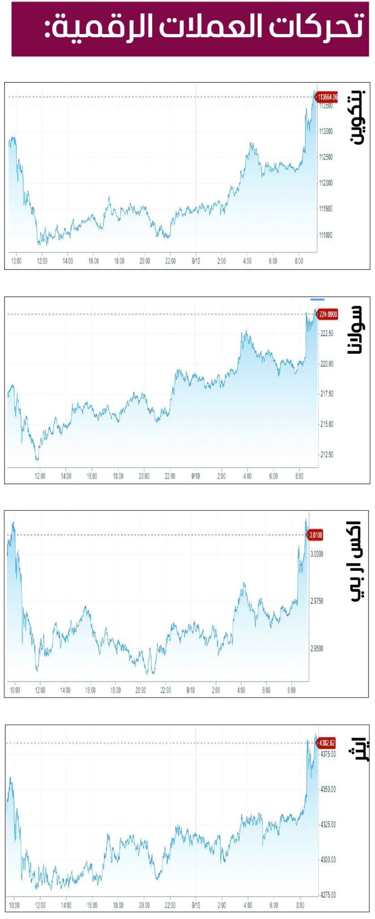وزادت الإيثيريوم، ثاني أكبر العملات المشفرة من حيث القيمة السوقية، بنسبة 3.7% إلى 4.424 دولارات، فيما أضافت الريبل نسبة 1.5% عند 3.07 دولارات، فيما قفزت سولانا بنسبة 3.5%.