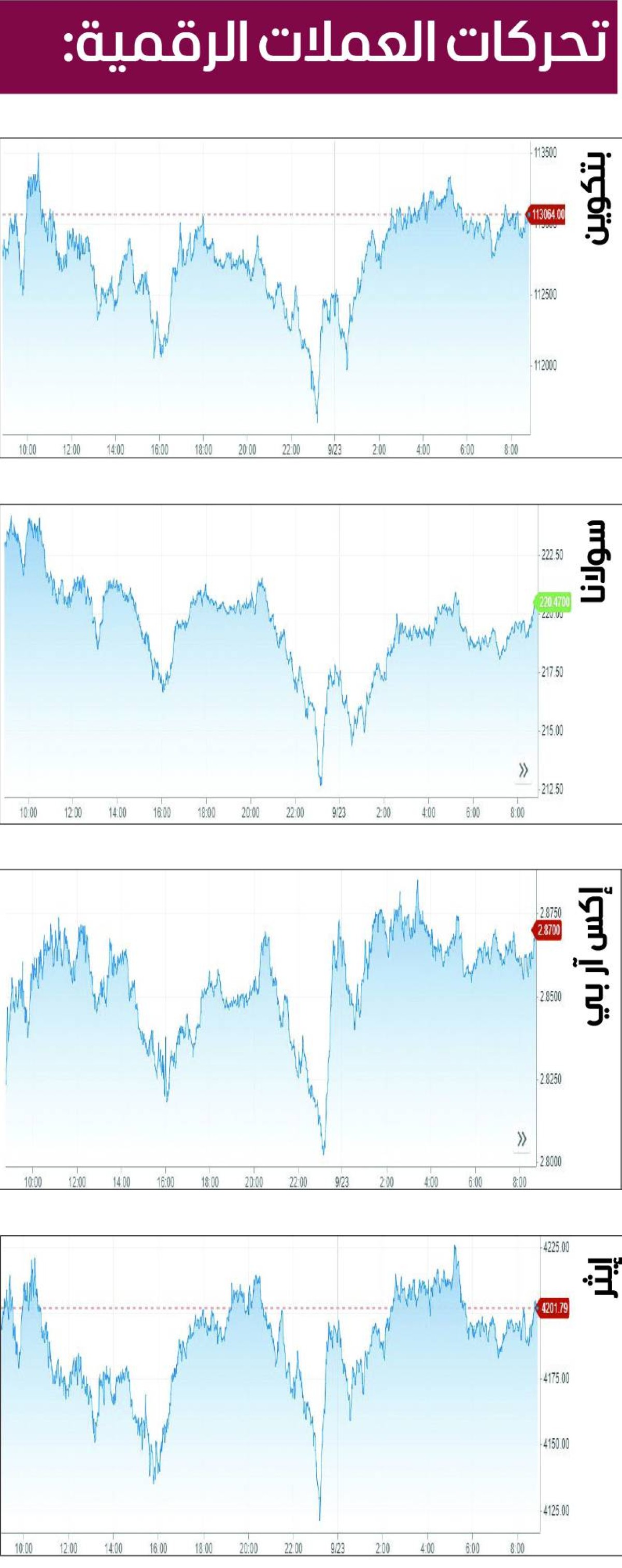 ارتفعت العملات المشفرة خلال تعاملات، أمس، لتتجه البتكوين نحو مستوى 113 ألف دولار، في ظل انتظار المستثمرين لإشارات جديدة من الاحتياطي الفيدرالي بشأن مسار الفائدة من خلال خطاب رئيس البنك جيروم باول المرتقب لاحقاً اليوم. وارتفعت البتكوين بنسبة 0.59% إلى 112855 دولاراً، وصعدت كل من الإيثريوم بنسبة 1.10% عند 4194.58 دولاراً، والريبل 0.97% إلى 2.8717 دولار، والدوج كوين بحوالي 0.97% إلى 24.1 سنتاً.