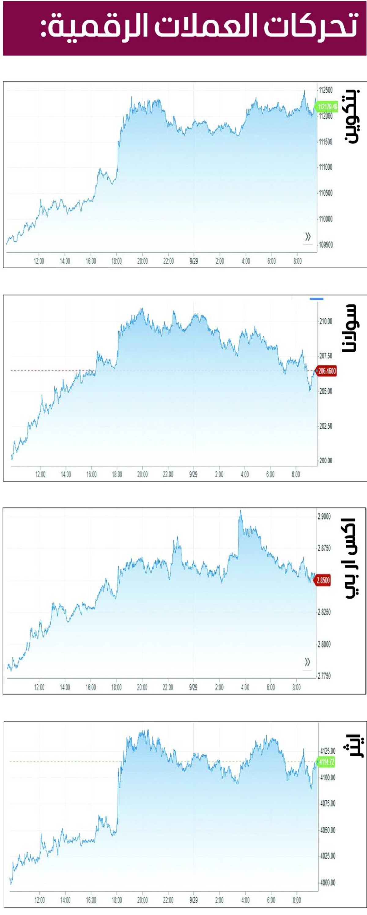 وتجاوزت القيمة السوقية العالمية للعملات المشفرة 3.87 تريليونات دولار، في حين بلغ إجمالي حجم التداولات خلال الـ24 ساعة الماضية 131.73 مليار دولار، وفقاً لبيانات «كوين ماركت كاب».
