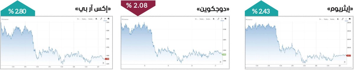 وعلى الجانب الآخر، تعرضت «دوجكوين» لضغوط بيعية ملحوظة، إذ تراجعت من 0.096 دولار إلى 0.093 دولار، بخسارة تجاوزت 2.08 %، بينما تمكنت «الريبل» إكس آر بي من تحقيق أداء قوي نسبياً، لترتفع من 1.4 دولار إلى 1.45 دولار، مسجلة نمواً يزيد على 2.80 %.