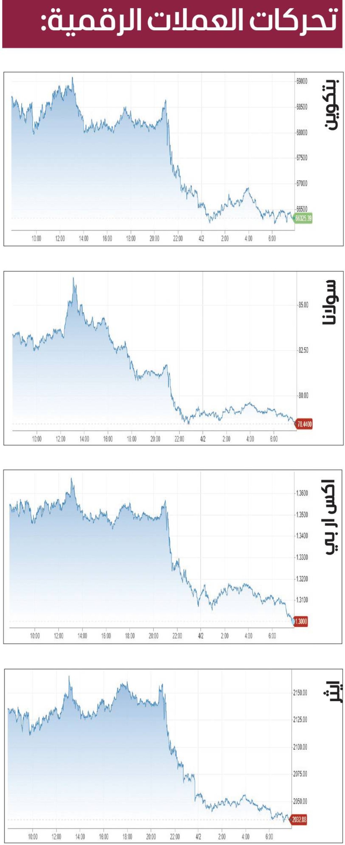 وتراجعت بتكوين بنسبة 2.68%، إلى 66.329 ألف دولار، وهبطت إيثريوم بحوالي 4.9%، عند 2034.9 دولاراً، وكذلك الريبل انخفضت بنسبة 2.35%، لتصل إلى 1.3163 دولار.