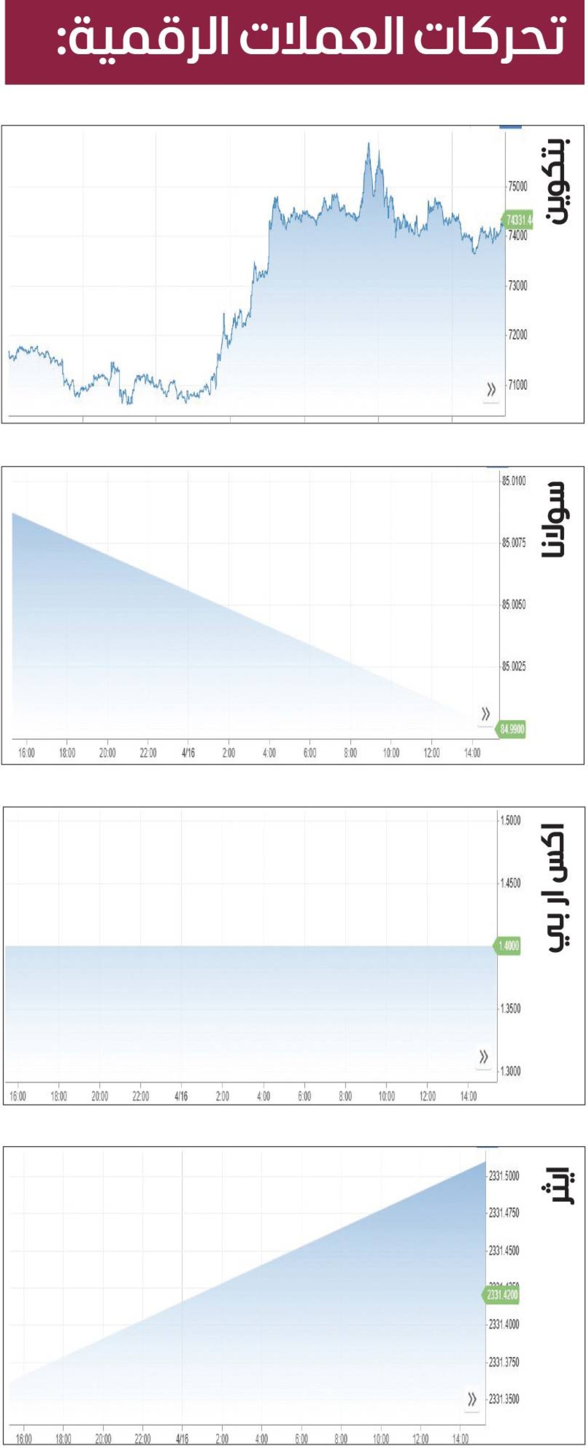 وانخفضت بتكوين بنسبة 0.86 %، إلى 74.335 دولاراً، بعدما لامست مستوى 75.44 ألف دولار في وقت سابق.