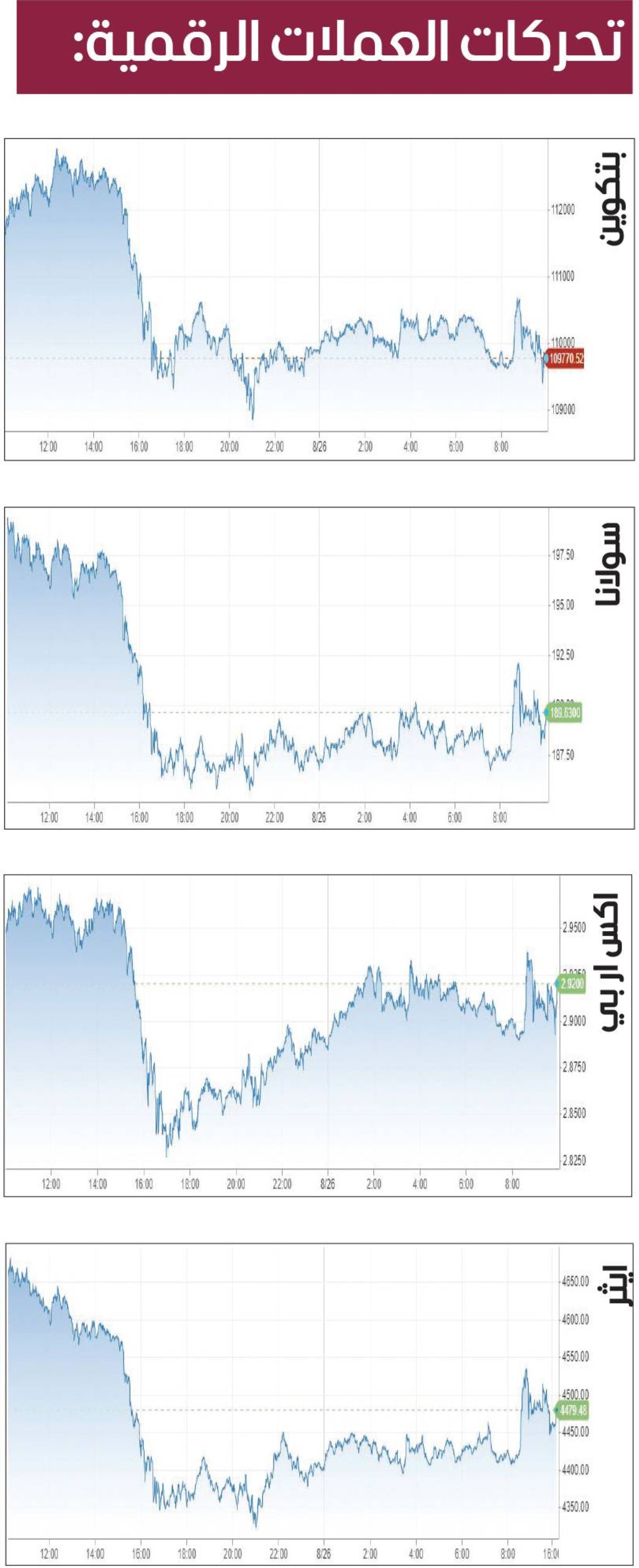 وهبطت أكبر عملة مشفرة بما يصل إلى 1.3%، إلى 109936 دولاراً، خلال تعاملات أمس، قبل أن تقلّص بعض خسائرها، بعدما لامست 108719 دولاراً، مسجلة أدنى مستوياتها منذ الثامن من يوليو.