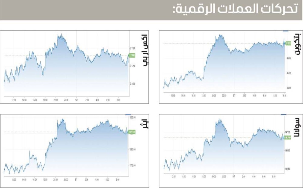 وتجاوزت «بتكوين» 97500 دولار بزيادة 3.3% خلال الـ24 ساعة الماضية قبل أن تتراجع مكاسبها، بينما ارتفعت قيمة الإيثريوم، ثاني أكبر عملة رقمية، بنحو 4.2%، قبل أن تقلص المكاسب إلى 2.7%.